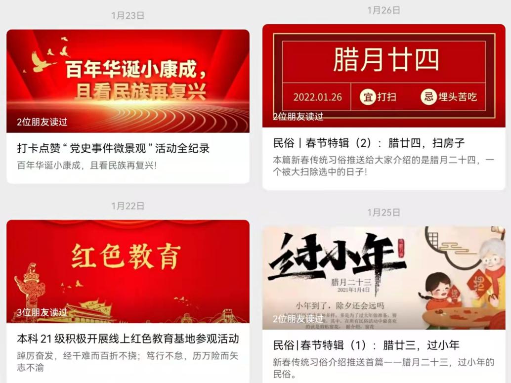 团学推出“E起过寒假”系列推送,陪伴电院学子在假期里更加自律,进阶自我,团学不断追求原创,贴近平凡朴实的生活,努力实现与读者共鸣,共频,共振。本科2020级、本科2021级公众号发表寒假计划及生活分享推送,鼓励学生坚持学习,充实自我,度过一个丰富、有意义的假期。本科2021级公众号持续推出新春民俗文化介绍15期,带领同学们了解各地春节习俗,增强文化底蕴;同时,发表线上红色教育基地参观活动总结和微景观打卡活动总结,记录同学们的实践活动,以此鼓励学生持续树立“学党史,跟党走”的信念,肩负历史使命,坚定前进信心。