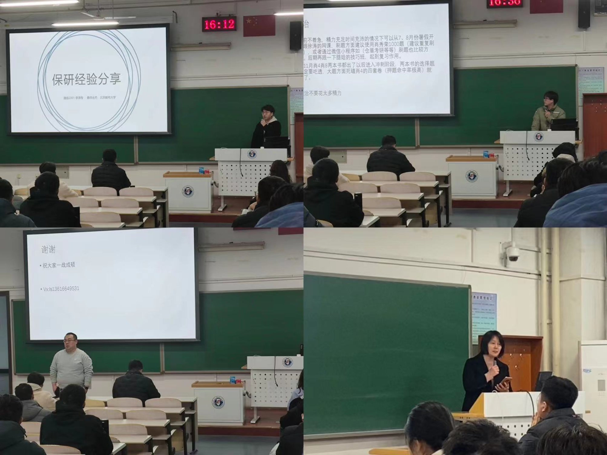王栋梁作总结讲话,围绕具体事例引导同学们对自身学习以及生涯规划进行思考。一是要想清楚“想成为怎样的人”这一问题再付出实际行动;二要通过体育锻炼或者心理疏导等方式进行缓解此阶段的压力;三要牢牢把握优势,付出比对手更多的努力,才能“一战上岸”。