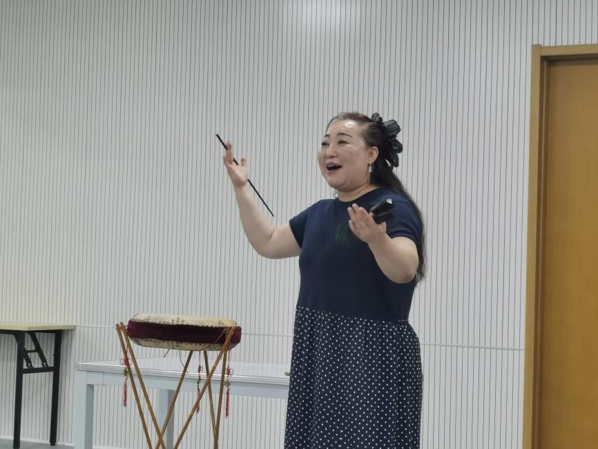曲艺团演员龚秾老师精心准备,为同学们带来《祝愿词》、京韵大鼓《爱北京》、西河大鼓《偷年糕》,或轻松诙谐或大气磅礴,老师优美的唱腔、丰富的肢体语言、精湛的表演技艺展现出中华文化的无穷魅力,让同学们充分感受到曲艺文化的美妙之处,提升对中国传统文化的鉴赏力。