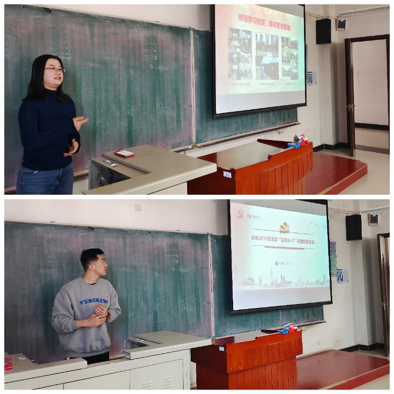 本科2019级党支部书记王欣和研电2015党支部书记孟一飞分别介绍了特色活动示范党支部创建、红色“1+1”示范活动的先进经验。王欣从支部基本情况、支部建设情况、工作建议三方面进行分享,提出党支部应结合上级要求、结合时事学习、结合个人发展创造性开展工作,做到提前制定计划、规范支部运行、有效开展活动。孟一飞从深化党史学习、继承先烈遗志、发挥特色优势、开展精准支教等四方面介绍支部共建情况,建议注重提升党员参与感和积极性,开展重实践、练能力、有意义的高质量共建活动。