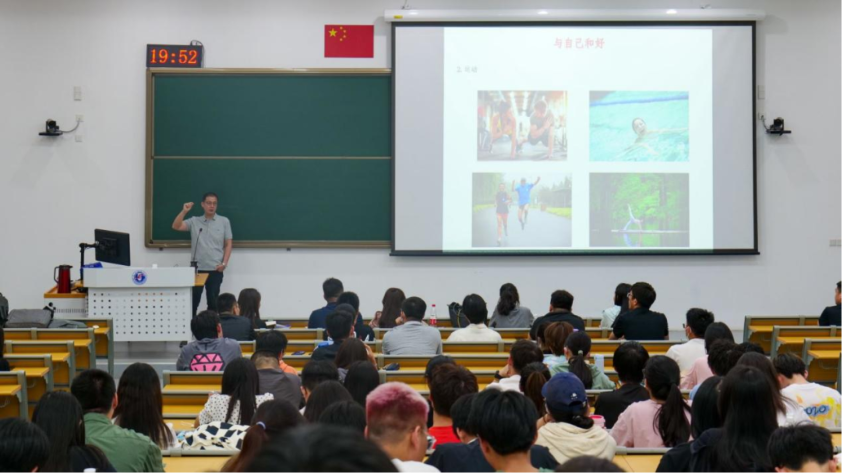 党委副书记王栋梁主持。胡邓教授结合自身旅行经历以及在人大的校园日常,从情绪简说、情绪管理和常用方法三方面,向大家分享了“与自己和好”的秘密。现场氛围活跃,同学们纷纷反馈收获颇丰。