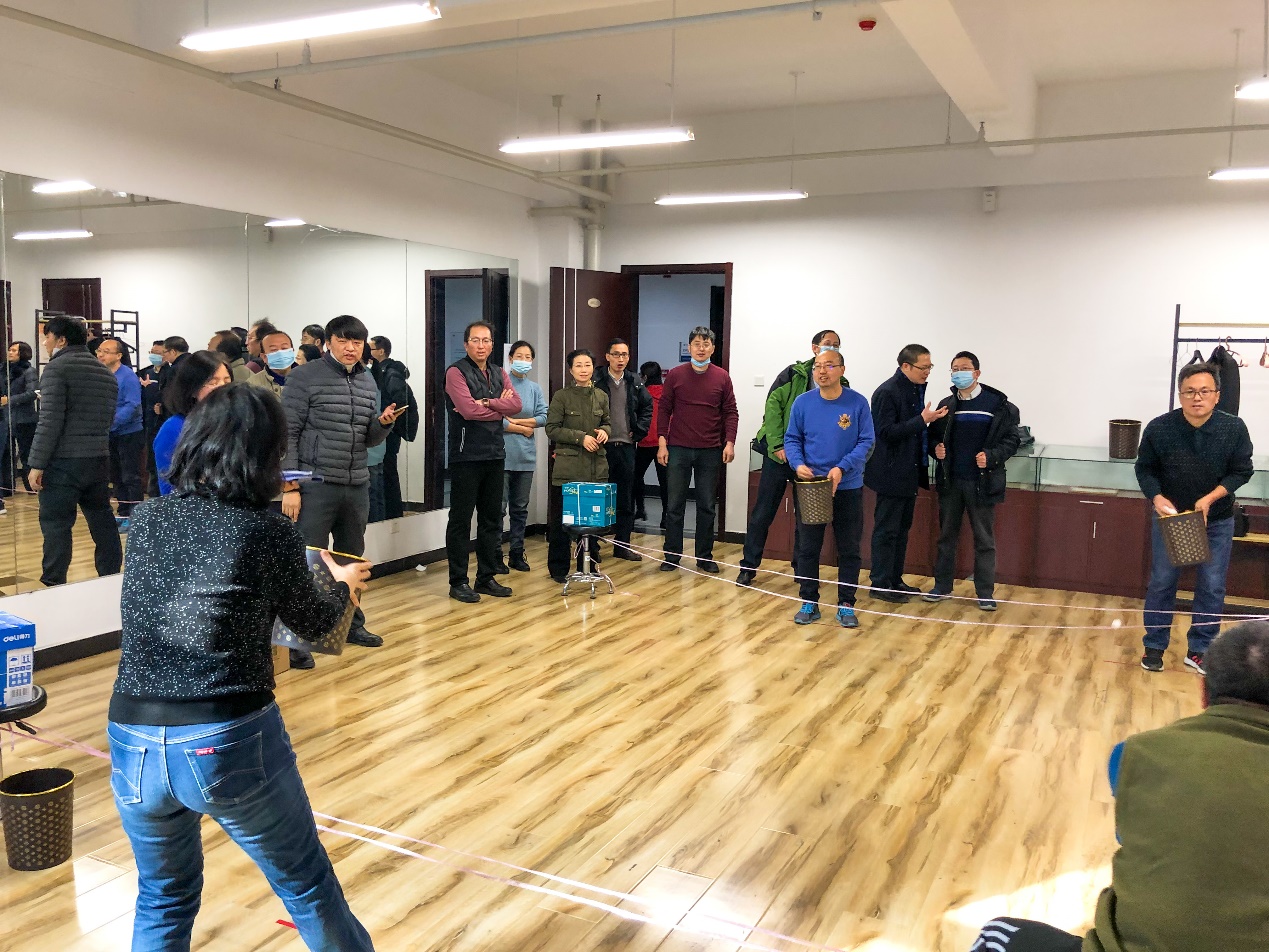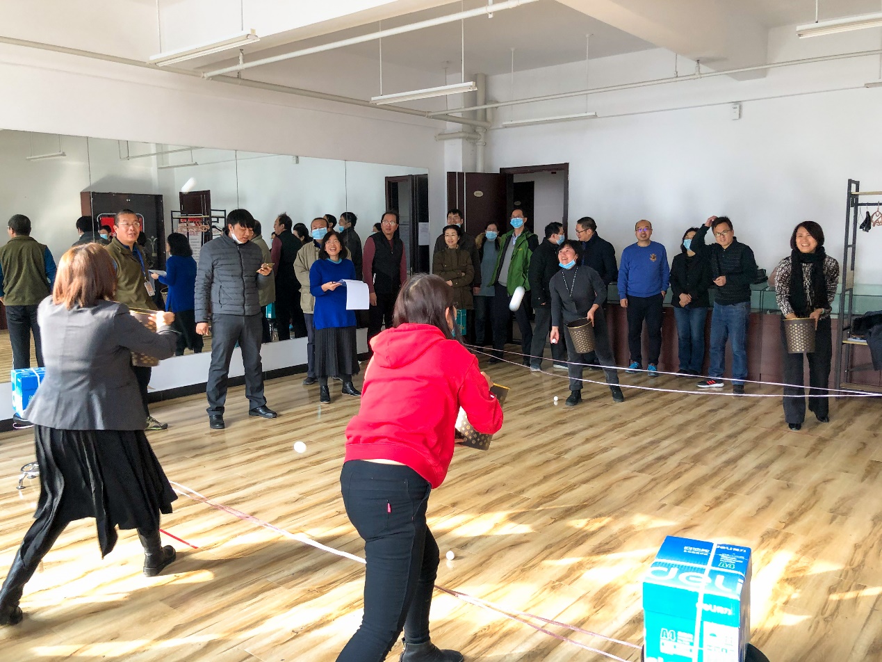各位老师两两自由组队,间隔3米,一人抛出乒乓球,另一人使用小桶接乒乓球,比赛时长30秒,计时结束后统计每组接到的乒乓球个数。老师们对本次活动热情满满,一个个都摩拳擦掌,比赛前热烈讨论组队事宜和抛球接球方法,屋内洋溢着轻松愉快的气息。