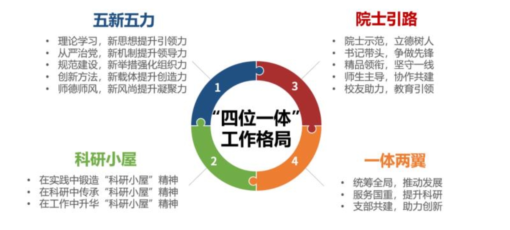 小屋”精神,提出“一体两翼”协同新布局,开展“院士+四个引路人”品牌活动,确保师生员工树牢“四个意识”、坚定“四个自信”、 坚决做到“两个维护”,锐意进取、扎实工作。