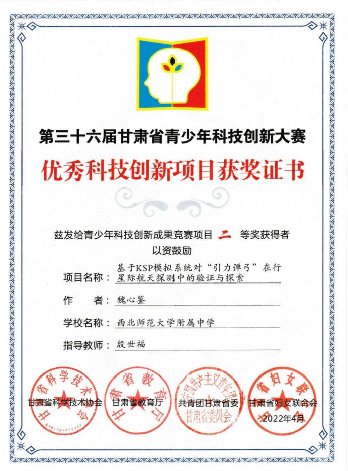 人员的孜孜不倦、精益求精。他将这种精神化于学科探究之中,高二时看到第三十六届全国科创比赛的举办消息,他不假思索地报了名。面对科创大赛“创新度、实践度、精深度”的办赛理念,基于对航天的喜爱与相关专业知识,魏心鉴将自己的研究课题定为了《基于KSP模拟系统对“引力弹弓”在行星际航天探测中的验证与探索》。从调阅论文、查阅各国相关资料、设计测试方案、组织模拟测控网,到“引力弹弓”轨道设计、单个航天器的设计布局、发射,再到将笔下的轨道设计还原到模拟系统中、模拟各国有关探测器的变轨过程,魏心鉴全部自行完成,最后呈现出自己的课题报告并完成现场答辩,最终获评为省级二等课题。每当遇到艰深的理论或模拟中不测的意外,他也有过无从下手和迷茫彳亍。他热爱航空航天,不单单欣赏腾飞升空的绚丽和遨游天宫的浪漫,更感动于能让这些庞然大物如燕般翻飞的力量与精神。“从最小的旋翼机到偌大的空间站,工程师们能够将它们从图纸变为现实,从零件变为整体,从实验室走向空天,背后一丝不苟、尽善尽美的精神,不应该是每一个华电人应有的品质吗?”魏心鉴说出了他热衷科技创新的原因。他以华电甘肃省第一名的成绩进入91成人
