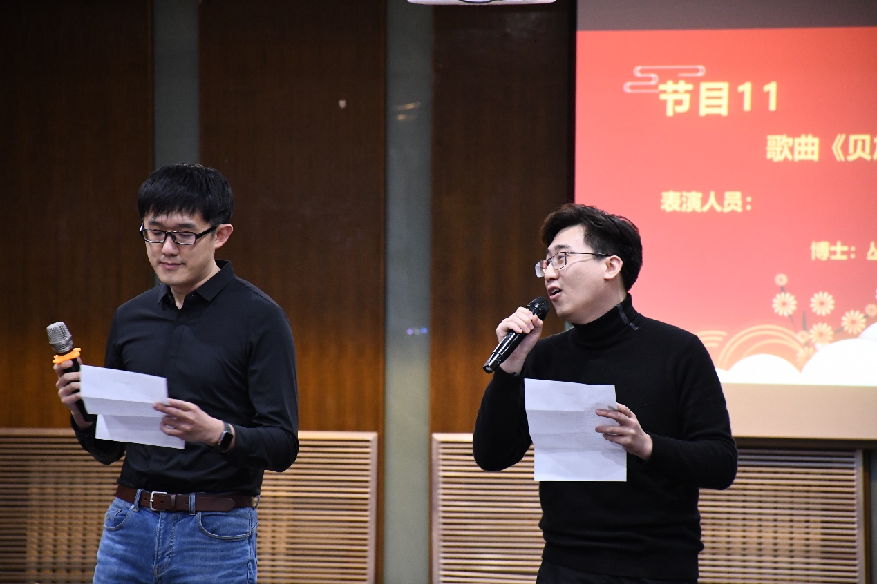 值得一提的是,老师们和博士研究生也带来了精彩的节目。郑华老师带来了独唱《风吹麦浪》,王雁凌老师全体课题组带来舞蹈《站着等你三千年》,全体老师带来了轻盈优美的歌伴舞表演《红枣树》。博士研究生从野和李雲建带来了合唱《贝加尔湖畔》和《我和我的祖国》,大家在歌声中感受到浓浓的爱国情怀,全场氛围到达了最高点。