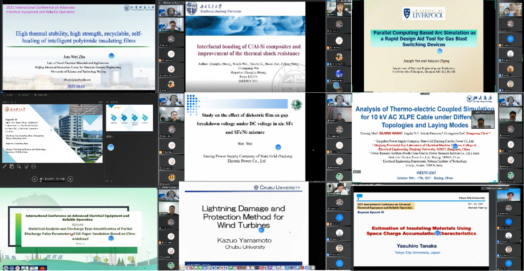 人员、工程技术人员和高校教师的参与并关注,论文录用稿件229篇;本次大会特邀请到了英国University of Liverpool大学Joseph Yan教授、巴西University of Campinas大学Maria Cristina Tavares教授、日本Chubu University大学Kazuo Yamamoto教授、日本Tokyo City University大学Yasuhiro Tanaka教授在开幕式上发言。会议还重点围绕“电力设备绝缘结构设计与优化”、“电力系统过电压与绝缘配合”、“气体放电与等离子体”、“电介质与绝缘材料”、“电力系统与设备优化运行”和“电力设备状态监测与故障诊断” 6个专题邀请相关专家学者作学术报告,与会专家分别从不同的视角与参会人员展开丰富热烈的讨论,国内外知名专家与青年学者齐聚一堂,共商学术发展大计。