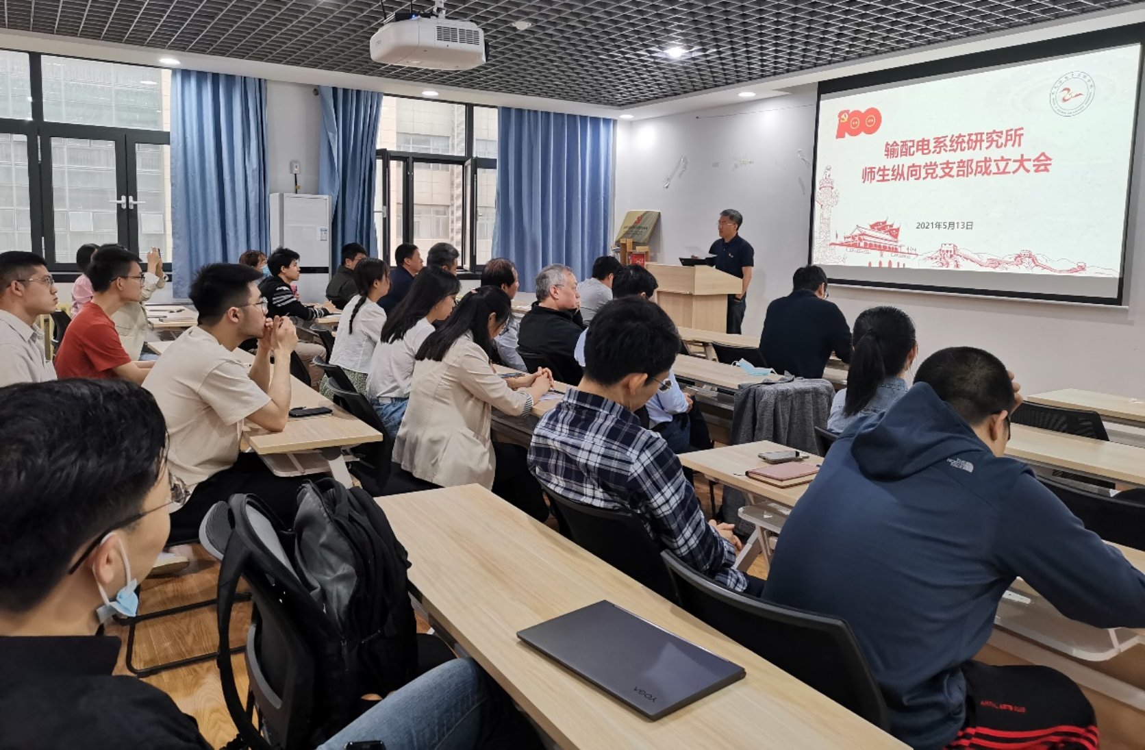 全体参会人员一同观看人民日报新媒体推出的建党百年主题MV《少年》。之后,输配电系统研究所师生纵向党支部书记刘念介绍了支部的成立初衷、建设目标和建设思路。支部在党建引领事业发展、服务国家能源安全战略、以及科教融合协同育人方面成效卓越,获评全国“双带头人”教师党支部书记工作室,并依托工作室建设师生纵向党支部,以保障电网安全为特色,以育人小循环、服务国家战略需求大循环的“双循环”体系为建设架构,落实“党建强基”、“凝心聚力”、“创新攻坚”三大工程,打造以党建引领驱动“91成人